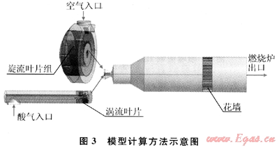 因?yàn)槿紵鲀?nèi)具有旋流葉片,而且燃燒爐體積龐大又涉及燃燒反應(yīng),因此本次模擬對(duì)網(wǎng)格精度要求較高。鑒于此,筆者將燃燒爐分為空氣室、酸氣入口管及燃燒爐爐體3部分分別進(jìn)行計(jì)算,計(jì)算示意圖如圖3所示,空氣室和酸氣入口管內(nèi)不涉及組分燃燒,此區(qū)域內(nèi)僅進(jìn)行流場計(jì)算,而且單獨(dú)計(jì)算時(shí)出口截面邊界條件誤差微小,對(duì)兩出口截面上速度大小和方向的整體性影響不大。計(jì)算完成后利用profile功能將上述兩結(jié)構(gòu)的出口參數(shù)導(dǎo)出,作為燃燒爐爐體的空氣及酸氣入口條件。采用此方法對(duì)燃燒爐結(jié)構(gòu)進(jìn)行模擬,可以大大減少網(wǎng)格數(shù)量,節(jié)省計(jì)算時(shí)間,并且提高計(jì)算精度。