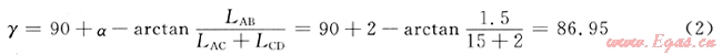 由地震剖面和隨鉆實測資料,3665m以后該井α為上傾2°,為避免儀器再次碰頂,盡量使井眼軌跡保持在靶體中間,亦即假定鉆頭到層界面距離LCD是2m,本井隨鉆電阻率的探測深度為1.5m,隨鉆測井儀器距離鉆頭LAC=15m,由式(1)計算的γ為: