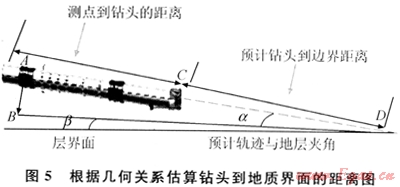 由于靶體只有4m高,鉆進過程容易鉆出目的層,為了優(yōu)化井眼軌跡,使鉆頭在目的層最有利位置鉆進?,F(xiàn)場根據(jù)LWD儀器探測深度、傳感器到鉆頭距離、鉆頭到層界面距離關系來計算儀器鉆進的最佳井斜角(圖5)[9]。其計算公式為: