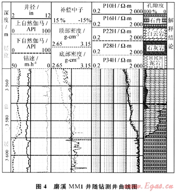 為調(diào)整鉆頭使其回到目的層,現(xiàn)場決定以7。狗腿減小井斜。經(jīng)過降斜到90°,鉆至3664m發(fā)現(xiàn)鉆速由3.8m/h增加到7.4m/h,密度由2.95g/cm3減小到2.80g/cm3,補償中子增加到7.7%,電阻率也由1800Ω·m降到200Ω·m,用校正后的中子和密度交會得到孔隙度為6%~10%,巖性為白云巖。表明儀器已經(jīng)由上部石膏層鉆回目的層。