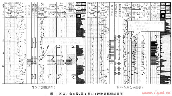 蘇X井盒8段(圖4),峰形飽滿,全烴顯示厚度比儲(chǔ)層厚度大,氣測(cè)解釋為氣層,電測(cè)解釋氣層,綜合分析解釋為氣層,試氣獲無阻流量9.7914×104m3/d的工業(yè)氣流。蘇Y井山1段(圖4),全烴峰值顯示較低,峰形不飽滿,全烴顯示厚度小于儲(chǔ)層厚度,氣測(cè)解釋為氣水同層,電測(cè)解釋為差氣層,綜合分析為氣水同層。經(jīng)測(cè)試井口產(chǎn)量0.035 4×104m3/d,水36m3/d,驗(yàn)證了利用聲波時(shí)差 電阻率圖版法與氣測(cè)綜合分析判斷識(shí)別氣水層的準(zhǔn)確性。