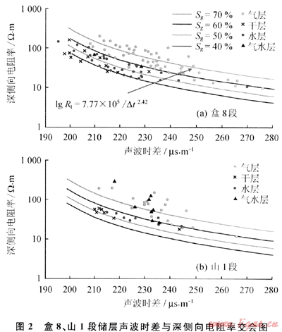 以蘇里格西部地區(qū)的完試資料基礎(chǔ)做分層位聲段聲波時(shí)差-深側(cè)向電阻率-含氣飽和度交會(huì)圖(盒8、山1段儲(chǔ)層及地層水礦化度不同),利用該圖版(圖2)可以看到:首先氣水層的電阻率沒有固定的界線值,隨著聲波時(shí)差的增大,氣層的電阻率降低;同時(shí),根據(jù)含水飽和度情況,可以在一定的波動(dòng)范圍內(nèi)酌情調(diào)整巖電參數(shù),使含水飽和度模型趨于合理化,氣水識(shí)別精度有了相應(yīng)的提高。