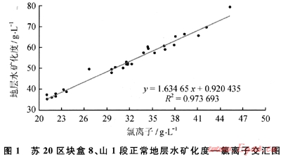 蘇20區(qū)塊盒8、山1段的地層水中氯離子含量在20320~49060mg/L,占陰離子總量的98%以上。地層水礦化度與Cl-含量交會(huì)圖(圖1)中的交會(huì)線對(duì)應(yīng)性很好,表明地層水中的Cl-嚴(yán)格控制總離子量,氯離子和礦化度幾乎同步等速變化。