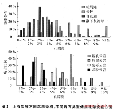 沉積微相是有利儲層發(fā)育的基礎(chǔ)。從沉積作用的角度來看,川東石炭系主要發(fā)育潮坪沉積體系,主要的沉積微相是粒屑灘、云坪、潮下灰泥坪、與膏鹽湖等沉積微相[14~15]。根據(jù)對這些沉積微相的儲層孔隙度等的統(tǒng)計,展示粒屑灘微相的白云巖儲層物性最好(圖2上),孔隙度區(qū)間多介于3%~9%,部分可超過9%,這是因為粒屑灘不僅存在一定的原始沉積孔隙,為埋藏期儲層的白云化、溶蝕作用的發(fā)生創(chuàng)造了有利條件,而且使溶蝕孔隙成為主要的儲集空間。其次是云坪微相,其孔隙度區(qū)間為1%~7%,也有部分超過9%;而潮下灰泥坪與膏鹽湖微相的儲層孔隙度多低于4%,只有少量為4%~9%。因此,粒屑灘沉積微相最有利儲層的形成,并對儲層的后期改善起到重要促進(jìn)作用。