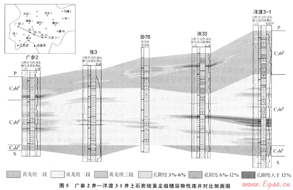 石炭系儲層具有較強(qiáng)的非均質(zhì)性與不連續(xù)性特征。其白云巖儲層的厚度及物性變化很快(圖5),雖然石炭系都發(fā)育儲層,但儲層發(fā)育的層位并不相同,有的呈現(xiàn)不連續(xù)特征。石炭系黃龍組單個白云巖儲層厚度多在1~5m,個別疊合后可達(dá)10m厚,這顯示石炭系存在廣泛發(fā)育局限小型巖性圈閉的可能性。
