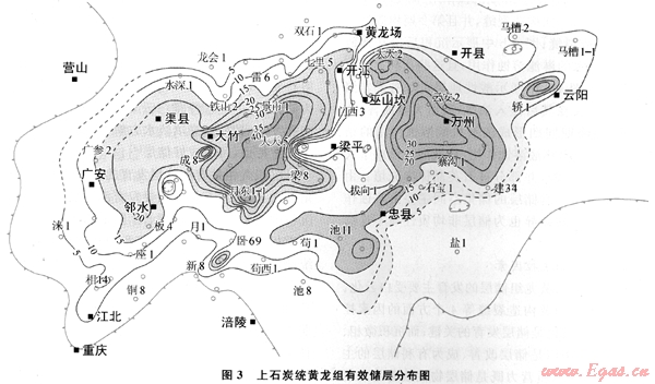 川東石炭系儲層分布廣泛,有效儲層多在黃龍組地層厚度大于10m的石炭系分布區(qū)[17~18]。有利的白云巖儲層(孔隙度大于3%)主要發(fā)育于開江古隆起的兩側(cè)地區(qū),厚度可達(dá)40m(圖3);在石炭系發(fā)育較薄的西南、東南與東北部地區(qū),白云巖儲層多小于10m;在西北部龍會達(dá)州地區(qū),石炭系的地層厚度雖然較厚,但是主要發(fā)育石灰?guī)r,儲層基本不發(fā)育。