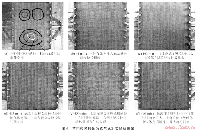 最終的實(shí)驗(yàn)結(jié)果是3個(gè)相對高滲砂體中含氣,而周圍的細(xì)砂中含水,尤其值得注意的現(xiàn)象是,在最底部的相對粗砂中雖然充滿了氣,但其中的細(xì)砂仍然含水。