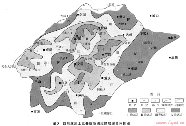 對影響儲層發(fā)育的3個(gè)主要因素(沉積相、巖石相和成巖相)進(jìn)行研究和評價(jià),分別編制出3個(gè)儲層段的沉積相平面圖、巖石相平面圖和成巖相平面圖,并評價(jià)有利相區(qū)的展布。在此基礎(chǔ)上,根據(jù)低孔低滲儲層分類評價(jià)標(biāo)準(zhǔn),將須家河組儲層綜合分為4類,分3個(gè)儲層段進(jìn)行綜合評價(jià),認(rèn)為Ⅱ-Ⅲ類儲層大面積分布(圖3)。