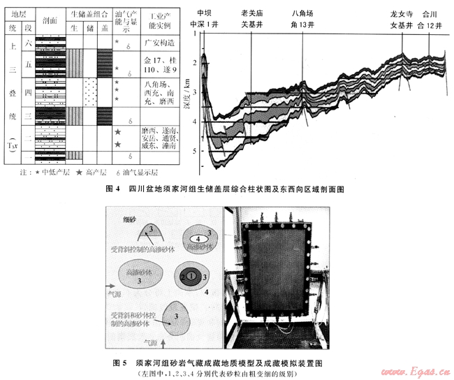 3) 綜合分析須家河組氣源巖、生儲蓋層空間配置等油氣地質(zhì)條件,評價(jià)烴源巖生烴潛力。結(jié)合氣藏解剖,首次開展氣水置換的成藏模擬試驗(yàn),認(rèn)為砂巖儲層物性的相對差異是能否聚氣的關(guān)鍵。