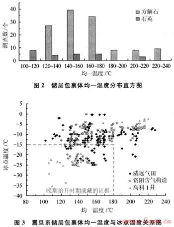 從威遠、資陽地區(qū)震旦系儲層以方解石為宿主礦物的包裹體均一溫度分布看,均一溫度分布在120~180℃的占絕對優(yōu)勢,同時也檢測到大于180℃的高溫包裹體(圖2)。而從均一溫度與冰點溫度的相關(guān)關(guān)系(圖3)分析,均一溫度分布在120~180℃的包裹體,其冰點溫度有很大的差異,這實際上反映了兩期烴類的充注,即印支期液態(tài)烴類的充注(低溫高冰點)和晚期地層抬升剝蝕過程中氣態(tài)烴類的充注(低溫低冰點)。大于180℃的高溫包裹體主要反映了地質(zhì)歷史時期中地層深埋、液態(tài)烴類發(fā)生裂解的燕山期。石英礦物中所檢測到的包裹體數(shù)量雖然不多,但其均一溫度分布范圍大,從102~206℃。