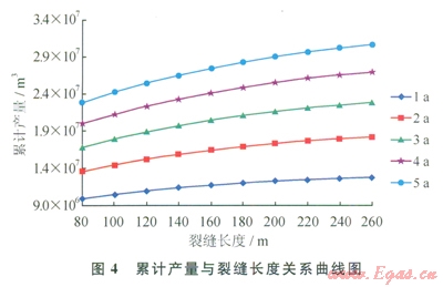 通過模擬不同縫網(wǎng)長(zhǎng)度下的壓裂井產(chǎn)能,并分析凈現(xiàn)值與縫網(wǎng)長(zhǎng)度的關(guān)系,其模擬結(jié)果如圖4、5所示。隨著裂縫長(zhǎng)度的增加,累計(jì)產(chǎn)量與凈現(xiàn)值在200~220m均出現(xiàn)拐點(diǎn)。因此優(yōu)選的縫網(wǎng)長(zhǎng)度為200~220m,此長(zhǎng)度下地質(zhì)模型中的改造體積為128×104m3。