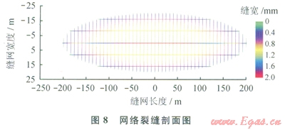 以優(yōu)化得到的高滲透帶長(zhǎng)度、滲透率為目標(biāo),借助頁巖壓裂設(shè)計(jì)軟件對(duì)不同液量、不同砂量下的壓裂網(wǎng)絡(luò)裂縫參數(shù)進(jìn)行模擬。模擬發(fā)現(xiàn):改造體積與液量成正相關(guān)關(guān)系,縫網(wǎng)長(zhǎng)度與前置液成正相關(guān)關(guān)系,它們均與砂量無關(guān),給定液量下裂縫導(dǎo)流能力與加砂量成正相關(guān)關(guān)系。最終在總液量為l600m3、總砂量為53m3下得到縫長(zhǎng)202m,改造體積102×104m3 (其小于地質(zhì)模型中改造體積的原因在于模擬得到的裂縫網(wǎng)絡(luò)為橢球形,而地質(zhì)模型中的等效高滲透帶為長(zhǎng)方體,后續(xù)研究中將對(duì)地質(zhì)模型進(jìn)一步改進(jìn)),縫網(wǎng)平均導(dǎo)流能力為0.039D·cm,平均縫網(wǎng)寬度為0.37mm,結(jié)合縫網(wǎng)參數(shù)計(jì)算得到等效滲透率為4.49mD,滿足設(shè)計(jì)要求。模擬得到的網(wǎng)絡(luò)裂縫參數(shù)如下:裂縫網(wǎng)絡(luò)長(zhǎng)404m,裂縫網(wǎng)絡(luò)寬40m,裂縫網(wǎng)絡(luò)高92m,平均DFN寬度為0.37mm,改造體積(SRV)1025500m3,DFN體積為43lm3,DFN平均導(dǎo)流能力為0.0397D·cm,等效滲透率為4.49mD。網(wǎng)絡(luò)裂縫形態(tài)如圖8、9所示。