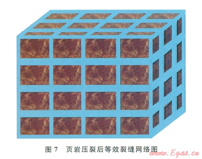 頁巖氣有效開發(fā)的前提就是頁巖儲層的大規(guī)模壓裂(體積壓裂),目的是形成復(fù)雜的裂縫網(wǎng)絡(luò),大大改善頁巖儲層的滲流能力。假設(shè)圖7所示的裂縫網(wǎng)絡(luò)等效整體壓裂后頁巖儲層的實(shí)際裂縫網(wǎng)絡(luò),壓裂裂縫寬度為w(m),小頁巖塊的長、寬、高均為a(m),則每個(gè)小頁巖塊的表面積為S=6a2(m2),每個(gè)頁巖塊所控制的裂縫體積約為V=3a2w.忽略井筒中殘留的壓裂液,則每個(gè)小頁巖塊吸水百分比為: