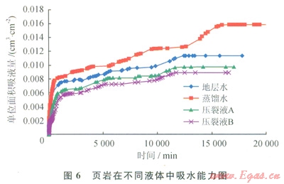 由于頁巖的吸水膨脹實(shí)驗(yàn)是在頁巖粉末壓實(shí)后的樣品上進(jìn)行的,因此它反映的是頁巖在不同液體中整體吸水的能力。而在實(shí)際地層情況下,頁巖是以致密巖石的形狀存在的,因此進(jìn)行頁巖儲層巖心吸水能力實(shí)驗(yàn)是研究頁巖儲層吸水能力的必要條件。