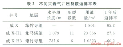 目前頁巖氣藏通常采用“低砂比”體積壓裂,裂縫寬度相對更小,因此頁巖氣藏返排時(shí)間長,返排率低是客觀必然。表2是某頁巖氣藏氣井的壓裂液返排數(shù)據(jù),可以看到商井的返排率最高,水平井水平段越長,壓裂規(guī)模越大,返排率越低。這與上面認(rèn)識一致,即壓力規(guī)模小,壓裂液更集中在井底附近的大尺度網(wǎng)絡(luò)縫隙中,返排率相對較高;壓裂規(guī)模入,壓裂液更多地分散在小尺度縫網(wǎng)中,返排率更低。