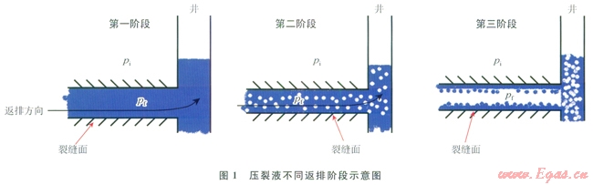 壓裂液在進(jìn)入貞巖之后,其返排過程大致可以分為以下3個(gè)階段(圖1):第一階段,水力壓裂裂縫中壓裂液的壓力(pf)大于原始地層壓力(pi)時(shí),由于壓裂液與巖石的綜合壓縮能,壓裂液會(huì)少量攜帶游離氣返排出來,此時(shí)反排難度最??;第二階段,當(dāng)pf<pi時(shí),此時(shí)處于生產(chǎn)初期,裂縫中為氣液兩相流動(dòng),氣體會(huì)驅(qū)替液體返排,此過程反排難度較?。坏谌A段,當(dāng)pf<pi時(shí),此時(shí)處于生產(chǎn)中后期,裂縫中自由水已經(jīng)被大量返排,而殘留在裂縫表面的水需要?dú)怏w大于臨界攜液流速才能帶走。