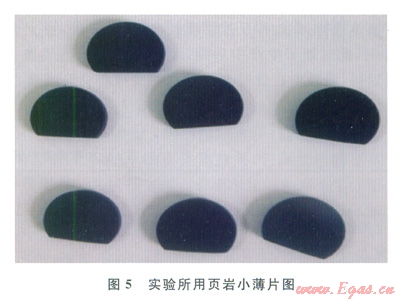 頁巖樣品實(shí)驗(yàn)裝置如圖4所示,實(shí)驗(yàn)方法如下:為了統(tǒng)一實(shí)驗(yàn)標(biāo)準(zhǔn),將頁巖磨成如圖5所示的大小均勻的薄片,薄片的厚度為3.45mm;然后將小薄片烘干(100℃)48h后冷卻,將頁巖薄片懸掛在天平上,沉入測試的液體中,記錄頁巖吸水后質(zhì)量隨時(shí)間的變化。