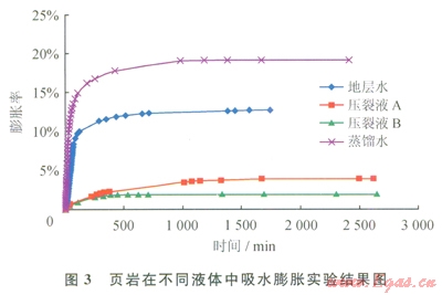 實(shí)驗(yàn)中使用的液體分別為蒸餾水、地層水、壓裂液A和壓裂液B,實(shí)驗(yàn)結(jié)果如圖3所示??梢钥吹巾搸r在蒸餾水中的膨脹率最高,接近20%;而壓裂液中頁巖的膨脹率比地層水和蒸餾水明顯低很多,說明了壓裂液在抑制頁巖吸水膨脹方面效果不錯(cuò)。