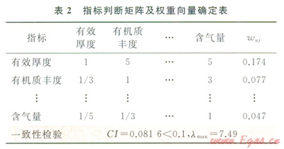 根據(jù)前述選取的指標(biāo)體系,通過調(diào)查專家意見,并參考專家以前在頁(yè)巖氣選區(qū)時(shí)賦予指標(biāo)不同的權(quán)重值,計(jì)算了各個(gè)指標(biāo)的權(quán)重。建立指標(biāo)兩兩判斷矩陣,計(jì)算最大特征值并檢驗(yàn)判斷矩陣的一致性(表2)。驗(yàn)證結(jié)果表明:矩陣具有滿意的一致性,層次分析法得到的指標(biāo)權(quán)重為:waj=(0.174,0.077,0.105,0.313,0.206,0.079,0.047).
