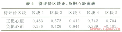 5個(gè)待評(píng)價(jià)區(qū)塊向量距離正、負(fù)靶心之間的距離如表4所示。