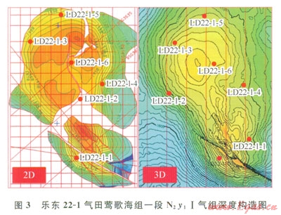 樂(lè)東22-l氣田三維地震解釋與二維解釋的構(gòu)造認(rèn)識(shí)發(fā)生了較大變化,以N1y2Ⅰ,工氣組為例,原二維資料解釋存在“Y”形斷層,但在三維資料解釋后斷層并不存在(3)。另外,三維地震解釋后部分主力氣組的構(gòu)造高點(diǎn)和幅度也發(fā)生了明顯的變化。為了減少構(gòu)造對(duì)氣田開(kāi)發(fā)的影響,進(jìn)行了儲(chǔ)層精細(xì)描述,并以此來(lái)優(yōu)選井位和指導(dǎo)隨鉆井軌跡調(diào)整,為氣田開(kāi)發(fā)成功實(shí)施奠定了基礎(chǔ)。