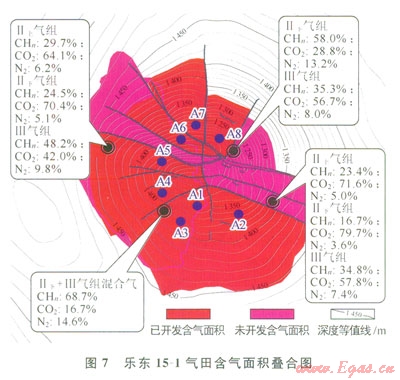 樂(lè)東l5-1氣出被斷層分割為多個(gè)斷塊,每個(gè)斷塊天然氣組分差異較大。天然氣中N2CO2含量較高,N2含量為3.6%~l4.6%,CO2 含量為l7.6%~79.7%,且CO2具有明顯的分層和分塊特點(diǎn)(7)。在平面上,構(gòu)造南面的組分較構(gòu)造北面好;縱向上同一氣組內(nèi)部,高部位的組分較低部位好。為了充分動(dòng)用各塊高烴地質(zhì)儲(chǔ)量,需要在各個(gè)斷塊進(jìn)行布井,但根據(jù)海上氣田開(kāi)發(fā)的特點(diǎn),要求開(kāi)發(fā)井?dāng)?shù)相對(duì)較少。由于各氣組(Ql3N2y1)平面上疊合性較好,構(gòu)造形態(tài)基本一致,壓力系數(shù)、物性相差不大,為了減少井?dāng)?shù),布井考慮采用多層合采來(lái)擴(kuò)大儲(chǔ)量動(dòng)用規(guī)模[10-13],盡可能地選擇在高烴區(qū)塊和構(gòu)造高部位布井,氣田實(shí)施后,7口生產(chǎn)井天然氣組分均好于預(yù)期。