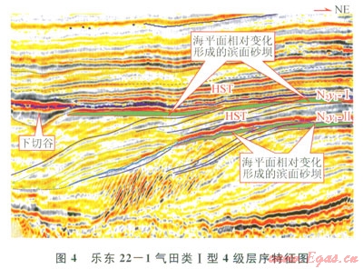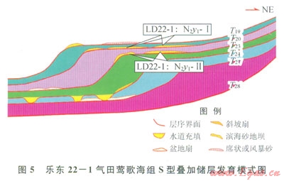 樂(lè)東22-1氣田主物源來(lái)自北東方向的海南島,為發(fā)育在陸架濱  淺海背景下,受沉積坡折控制的灘壩復(fù)合體沉積。儲(chǔ)層的形成,與海平面短期快速升降、強(qiáng)制性海退背景下形成的4級(jí)層序有關(guān)。4級(jí)層序界面以類(lèi)工型界面為主,層序結(jié)構(gòu)主要表現(xiàn)為前積型特征,頂積層較薄(4)。S型疊加4級(jí)層序的頂積層可形成良好的儲(chǔ)集層,在沉積坡折以下多以淺海相泥巖、泥質(zhì)粉砂巖為主,儲(chǔ)層不發(fā)育(5)。準(zhǔn)確把握層序形成機(jī)制和疊加樣式[7-8],可以有效地預(yù)測(cè)和把握有利儲(chǔ)層的分布,減少儲(chǔ)層預(yù)測(cè)上的失誤,降低風(fēng)險(xiǎn)。通過(guò)對(duì)儲(chǔ)層的精細(xì)描述,刻畫(huà)有利砂體的展布,指導(dǎo)生產(chǎn)井的部署和井位優(yōu)化。