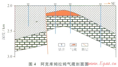 別什肯特坳陷與基薩爾褶皺隆起區(qū)新生代擠壓構造運動強烈,基底古構造破壞大,構造圈閉形成受新生代擠壓構造運動控制,以逆掩斷裂背斜、斷背斜和擠壓背斜等構造圈閉為主,圈閉幅度大。如位于基薩爾褶皺隆起區(qū)阿克庫姆拉姆氣田,為一北東走向的逆沖斷裂擠壓背斜構造氣藏,氣藏西翼被逆沖斷裂切割,碳酸鹽巖與鹽膏巖對接,形成側向遮擋,構成了逆沖斷裂背斜構造氣藏(4)。