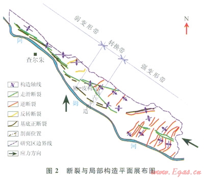 東部強變形帶指基薩爾褶皺隆起區(qū)和別什肯特坳陷,構造以逆掩斷裂背斜構造帶為主?;_爾褶皺隆起區(qū)構造變形強度最大,逆掩斷裂發(fā)育(2),愈靠近強烈活動的斷層,褶皺變形越明娩,并且臨近逆沖斷層—翼陡傾不對稱。逆沖斷裂平面呈北東走向的“S”形,另有一組北西西向走滑斷裂,切割北西走向的逆沖斷裂構造帶。別什肯特坳陷逆掩斷裂背斜帶呈狹長線形,走向北東,控制構造的主控斷層斷距和構造幅度較基薩爾褶皺隆起區(qū)小。