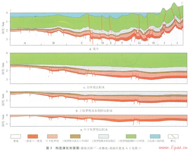 侏羅系—白堊系繼承了二疊系—三疊系的構造格局,地層厚度由西向東逐漸增厚,具有填平補齊特征,別什肯特坳陷區(qū)和基薩爾褶皺隆起區(qū)沉積厚度大,斷裂不發(fā)育(3-c3-b),召拉麥爾根隆起為繼承性隆起區(qū),別什肯特坳陷及鄰區(qū)保持了二疊紀—二徑紀裂陷期構造格局,沒有發(fā)生大的構造運動。