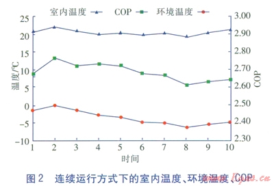 連續(xù)運(yùn)行方式的實(shí)驗(yàn)時間為l個月,每天運(yùn)行24h,每小時監(jiān)測記錄一次。以每3天為單位取室內(nèi)溫度、COP、環(huán)境溫度平均值,結(jié)果見圖2。其中橫坐標(biāo)值1代表實(shí)驗(yàn)的第l~3天,2代表實(shí)驗(yàn)的4~6天,依此類推。在此運(yùn)行模式期間,平均室外溫度為-3.47℃,最低日平均溫度為-6.6℃,最高日平均溫度為0.0℃,太陽輻射平均日總量為2353W/m2,集熱器平均日集熱總量為l411.8W/m2,室內(nèi)溫度在19.2~22.7℃范圍內(nèi)變化(平均達(dá)21.15℃),系統(tǒng)的平均COP達(dá)2.689,COP最低為2.614,最高為2.782。從圖2可知,系統(tǒng)連續(xù)運(yùn)行時的供暖溫度始終在人體舒適的溫度范圍內(nèi)波動,但是系統(tǒng)的COP值較小,說明能耗還可以進(jìn)一步降低。