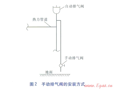 在原有自動排氣閥的基礎上,增設一個手動排氣閥,具體安裝方式見圖2。在自動排氣閥前的排氣管引出一根支管至地面附近,在支管末端安裝一個手動排氣閥。在換熱機組啟動前,運行人員打開手動排氣閥,快速排除管道內(nèi)的不凝性氣體,直至供回水壓力穩(wěn)定且僅有水而無氣體排出時,再關閉手動排氣閥。此后,可完全依靠自動排氣閥排氣,這樣即可確保換熱機組的安全穩(wěn)定運行。