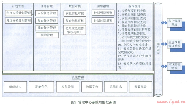 根據燃氣公司需求,管理中心系統由系統管理、計劃管理、任務管理、數據審核管理、預警報價、查詢統計和接口服務等模塊構成。管理中心系統功能框架圖如圖2所示。