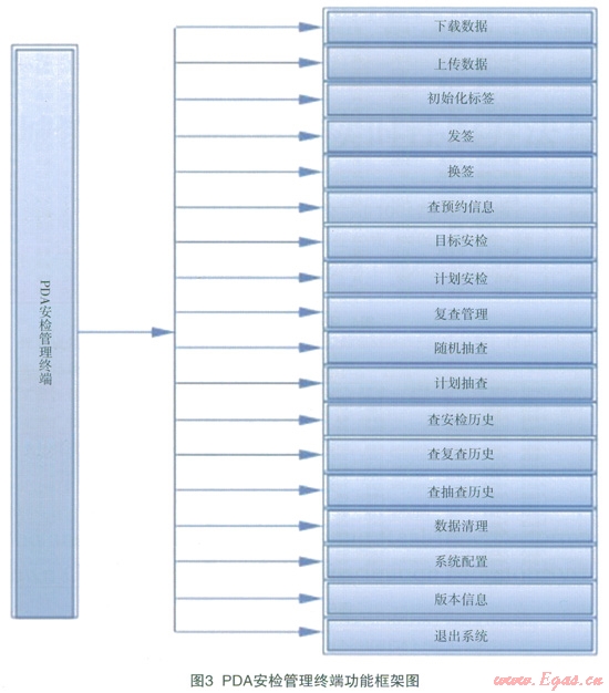 PDA安檢管理終端為安檢人員進行發(fā)簽、安檢、復查、換簽,以及安檢管理人員的安檢抽查提供現場操作手段。PDA安檢管理終端功能框架圖如圖3所示: