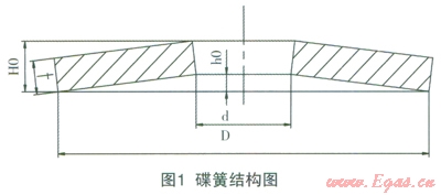 浮動(dòng)碟簧采用了類似普通蝶形彈簧的碟形結(jié)構(gòu)。它用的是高彈性模量的合金材料加工而成。其結(jié)構(gòu)特點(diǎn):簧片較厚、拱高較小?;善穸?span lang="EN-US">t要比相同直徑大小的普通蝶形彈簧厚,而拱高h0則比相同直徑大小的普通蝶形彈簧的h0小。其結(jié)構(gòu)型式如圖1所示。