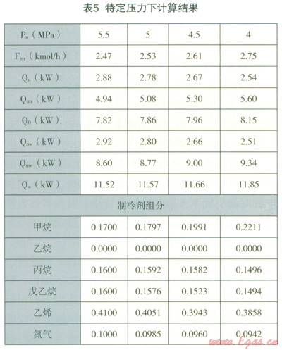 本文煤層氣組分為:甲烷98%、乙烷l%、氮氣1%、進氣溫度20℃;制冷劑的基礎(chǔ)組分為:氮氣10%、甲烷l7%、乙烯41%、丙烷l6%、異戊烷16%;LNG的存儲壓力為0.38MPa。制冷劑循環(huán)量Fmr的計算方法如下: