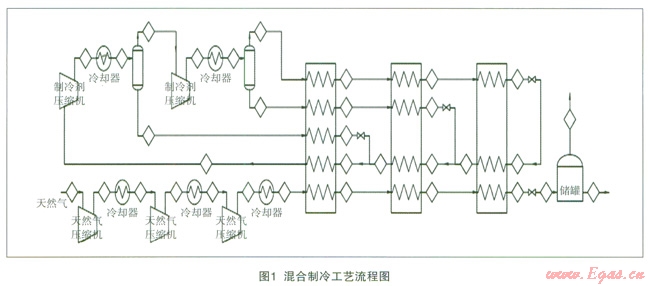 流程簡述:天然氣原料通過壓縮機一級壓縮并和循環(huán)水換熱,然后通過二級壓縮二次和循環(huán)水換熱,再經(jīng)過三級壓縮換熱進入換熱器(LNGl00)和制冷劑一次換熱,再經(jīng)換熱器(LNGl01)二次換熱,最后進入換熱器(LNGl02)換熱流入LNG大罐。另一路為制冷劑閉路循環(huán)從板翅式換熱器LNGl00復(fù)熱回來的制冷混合劑經(jīng)離心壓縮機一級壓縮換熱,流出分兩路,液體進入板翅式換熱器進行節(jié)流換熱。一路混合氣體再次經(jīng)二級壓縮換熱,分兩路氣體和液體氣體一路進入板翅式換熱器,二級壓縮分離出來的液體經(jīng)板翅式換熱器(LNGl00、LNGl00、LNGl00)換熱匯總到離心壓縮機進口。
