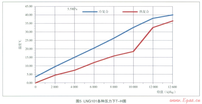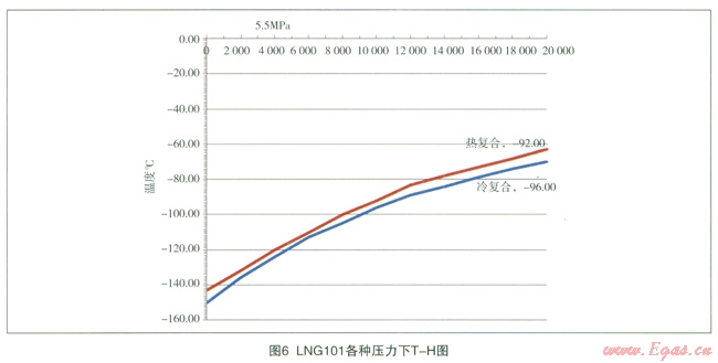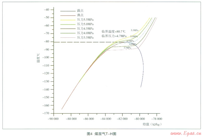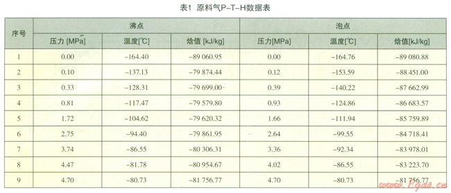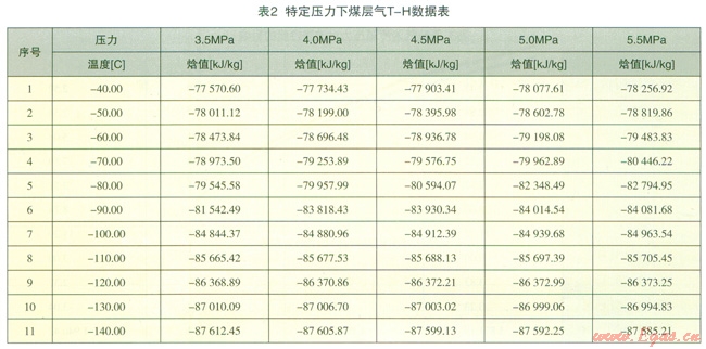 在特定壓力下,利用根據(jù)圖l建立的系統(tǒng)模型對煤層氣從初溫-40℃冷卻至-l40℃的過程中對煤層氣的T-H進行模擬計算,結(jié)果詳見表2。