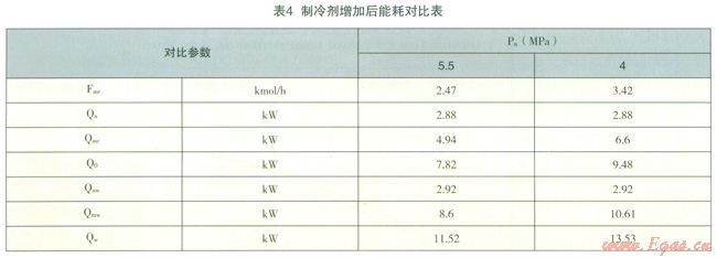 同時由圖4可以看出,隨著Pn的降低,原料氣的液化曲線不斷下移,而且愈加不平滑,由圖5~圖8可見換熱器(LNGl02)最小換熱溫差逐漸變小,當(dāng)壓力降至4.0MPa時最小溫差變?yōu)樨?fù)值,換熱器(LNGl02)無法收斂。此外由于換熱溫差減小,導(dǎo)致LNG換熱器的UA值不斷增大。對于已建工廠,由于換熱器的體積一定,且換熱器內(nèi)流體的流動狀態(tài)、各項物性參數(shù)也不會發(fā)生太大變化,因此其UA值也基本是一個定值,因此此時若不對制冷劑組分進行調(diào)整,則需增加制冷劑的循環(huán)量。在保證LNGl02換熱器UA基本不變的情況下增加制冷劑循環(huán)量處理每kmol原料氣的計算數(shù)據(jù)見表4。