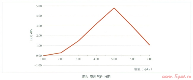 利用流程模擬圖可以原料氣P-T-H(P:壓力、T:溫度、H:焓值)的相關(guān)數(shù)據(jù),具體數(shù)據(jù)及曲線圖見表1、圖2、圖3。