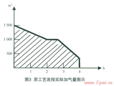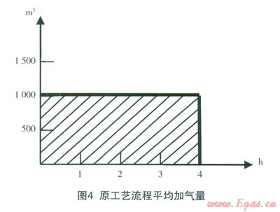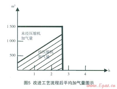 改進(jìn)工藝流程平均加氣量圖示:上部為管束氣瓶直接加入CNG汽車天然氣氣量,下部為經(jīng)壓縮機(jī)壓縮的加氣量;改進(jìn)工藝流程后加氣量由1000m3h增加到1500m3h;一輛管束車卸氣時(shí)間由原4h/車縮短到3h/車以內(nèi);改進(jìn)工藝流程后相對(duì)減少了壓縮機(jī)開機(jī)時(shí)間,減少了壓縮機(jī)的磨損并降低了能耗,實(shí)現(xiàn)了壓縮機(jī)在原有排氣量不變情況下提高加氣量的目的。