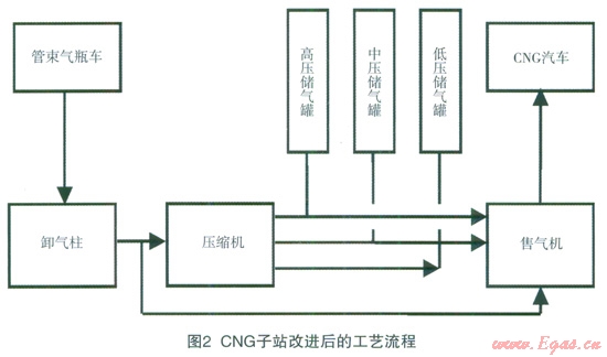 摘 要:CNG子站管束氣瓶中的天然氣經(jīng)卸氣柱后增設(shè)一路管線直接進(jìn)入加氣機(jī)低壓系統(tǒng),利用管束氣瓶中天然氣自身壓力對(duì)CNG汽車加氣,而后加氣機(jī)電磁閥自動(dòng)切換對(duì)CNG汽車加中、高壓