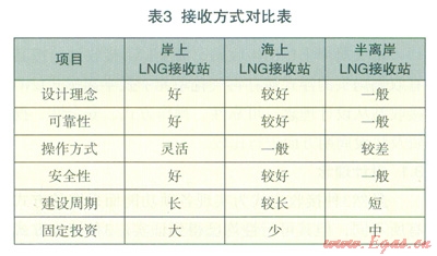 摘 要:本文結(jié)合國(guó)外LNG接收站的應(yīng)用實(shí)踐,介紹了岸上LNG接收站、海上LNG接收站、半離岸式LNG接收站的功能及特點(diǎn),分析比較了不同LNG接收方式的設(shè)計(jì)理念、可靠性、操作方式、安