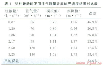 臨界流速是指巖屑發(fā)生躍移時(shí)的最低混合物流速。在達(dá)到臨界攜巖的狀態(tài)下,實(shí)測了氣液兩相混合真實(shí)攜巖臨界速度,再與多相流數(shù)值模擬軟件計(jì)算出的臨界混合速度對(duì)比,得出兩者的誤差。表l、2為鉆柱轉(zhuǎn)動(dòng)和鉆柱不轉(zhuǎn)動(dòng)時(shí)的結(jié)果對(duì)比。