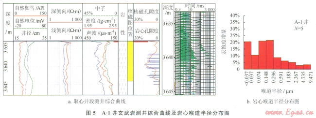 從孔喉大小看,圖5所示的基性玄武巖的孔喉半徑(圖5-b)要明顯的大于酸性花崗斑巖(圖4-b)?;孕鋷r孔喉半徑大于0.148mm的孔喉體積要明顯的大于酸性花崗斑巖,孔喉半徑大于0.148mm的孔喉體積兩口井分別是48%和l8.2%,孔喉半徑大小差異明顯。