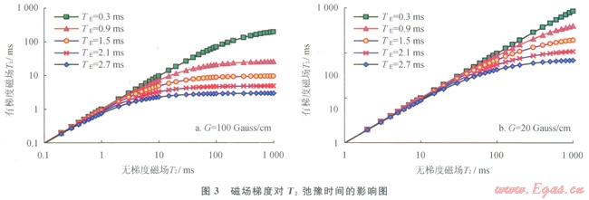 對比模擬的兩種大小的內(nèi)部梯度磁場對T2譜影響的成果圖可看出(圖3):相同回波間隔下,內(nèi)部磁場梯度越強,相同弛豫組分對應(yīng)的T2譜時間越短,意味著T2譜前移越明顯,使其向弛豫時間變短的方向移動。