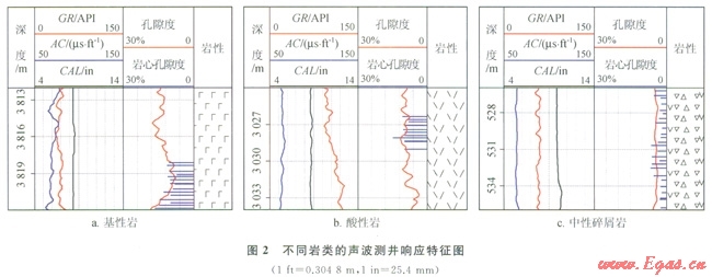 聲波測井能有效反映孔隙均勻分布的均質(zhì)地層的孔隙度,而火成巖儲層孔隙孔徑差別較大,孔隙分布不均勻,孔隙分布各向異性強,連通性差(圖1)。如準噶爾盆地陸東地區(qū)和克拉美麗氣田的火成巖儲層孔隙分布不均勻,如黃驊坳陷北堡地區(qū)火成巖儲層中普遍發(fā)育有連通性較差的氣孔和杏仁體內(nèi)孔[7],松遼盆地慶深氣田儲層中發(fā)育有孔喉比大、孔喉分選差的儲層,可見火成巖儲層的孔隙分布往往不均勻[8]。聲波測井記錄的是聲波傳播最快的首波,對于這種孔隙分布不均勻的儲層,聲波測井記錄的是繞過部分孔隙傳播速度最快的波,因為沿骨架傳播的聲波速度最快,故聲波測井在這類儲層中測得的速度往往偏低;此外,實測資料也顯示,從酸性巖到基性巖類,隨著鐵鎂礦物含量的增加,密度測井值和補償中子值是逐漸增大,且不同巖類間差別大,但聲波總體變化不大,差別較小。圖2是某地區(qū)基性熔巖、酸性熔巖和中性火山角礫巖的聲波時差對比圖,3種不同的巖性且孔隙度存在一定差異,但3種巖性的聲波時差差別較小。準噶爾盆地l97口井不同巖性的火成巖聲波時差統(tǒng)計也顯示,不同巖性火成巖的聲波時差無明顯的差異。大慶油田深層不同火山熔巖的聲波測井值也無明顯的差別。因此,不宜優(yōu)選聲波測井資料來計算火成巖地層的孔隙度。