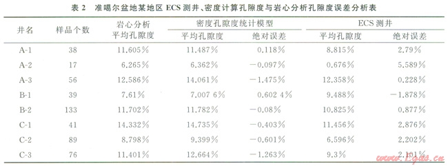 密度測井反映的是儀器探測范圍內(nèi)地層的總密度,能有效反映地層的總孔隙度,對各種類型的孔隙度都能有效反映,如火成巖地層中大的氣孔、溶蝕孔洞空隙都能反映。采用巖心刻度測井的方法,分區(qū)塊、分巖性建立了不同區(qū)塊、不同巖性的密度測井與巖心分析孔隙度間的線性回歸模型用于計算火成巖儲層的孔隙度,實際應(yīng)用表明,利用密度曲線計算的孔隙度與巖心分析孔隙度之間的誤差較小(表2)。