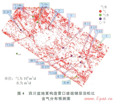 預(yù)測得到的含氣分布如圖4所示,紅色為含氣。該區(qū)4口純產(chǎn)氣井,3口井位于或緊鄰低泊松比部位(紅色),1口井位于不含氣部位,5口純產(chǎn)水井均位于不含氣的部位,3口氣水同產(chǎn)井都位于或靠近含氣部位,4口干井有2口井位于不含氣部位。總體看,l6口井3口井不符合(符合率為81)