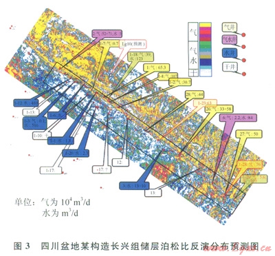 反演得到預(yù)測區(qū)域目的層泊松比均值分布圖(3),紅、黃色代表含氣,綠、藍(lán)色代表含水,灰、白色代表非儲層。圖3中指示框的顏色為含流體類別(氣、氣水、水),其中的數(shù)據(jù)為產(chǎn)量??梢钥吹?,預(yù)測的氣水分布與試油結(jié)果基本對應(yīng),效果較明顯,26口井有21口符合,符合率81%。